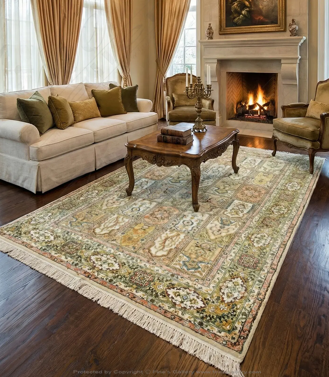Hand knotted silk in pretty pastel colors of pink and gold with accents of black. Please call 1-866-860-1710 and talk with a sales representative at anytime.