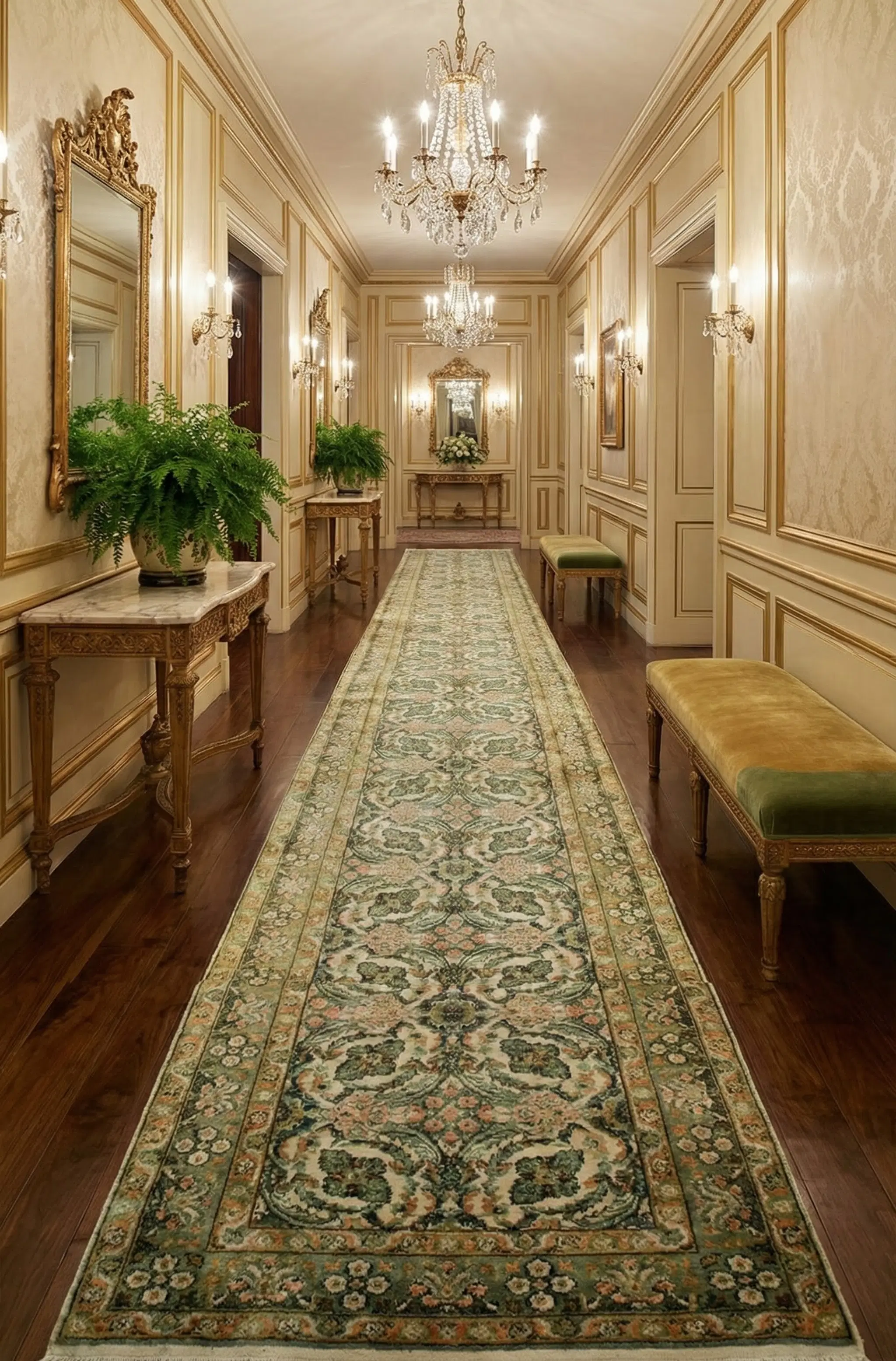 Multi color runner in hand knotted silk with green pink red and salmon. Please call 1-866-860-1710 and talk with a sales representative at anytime.