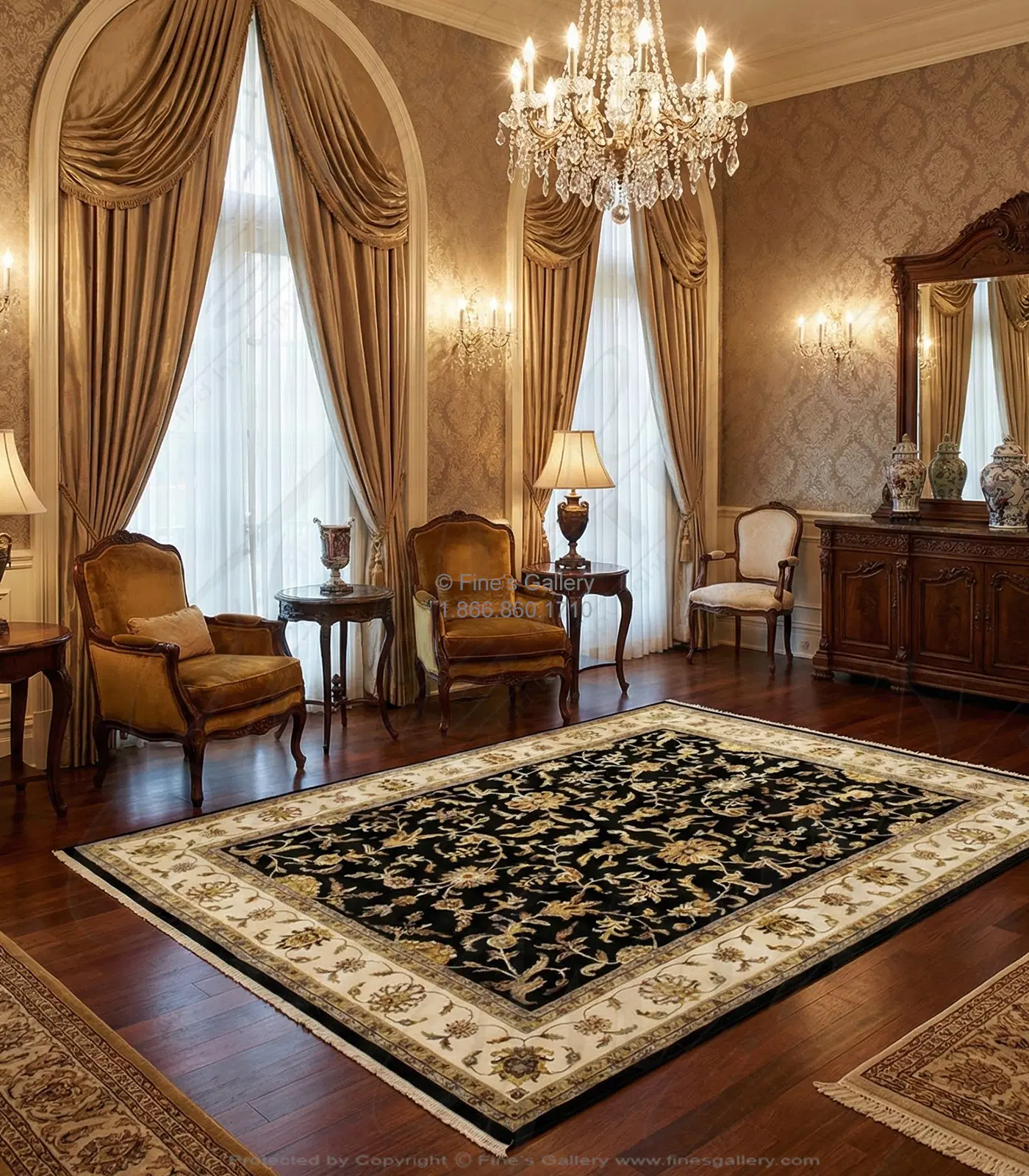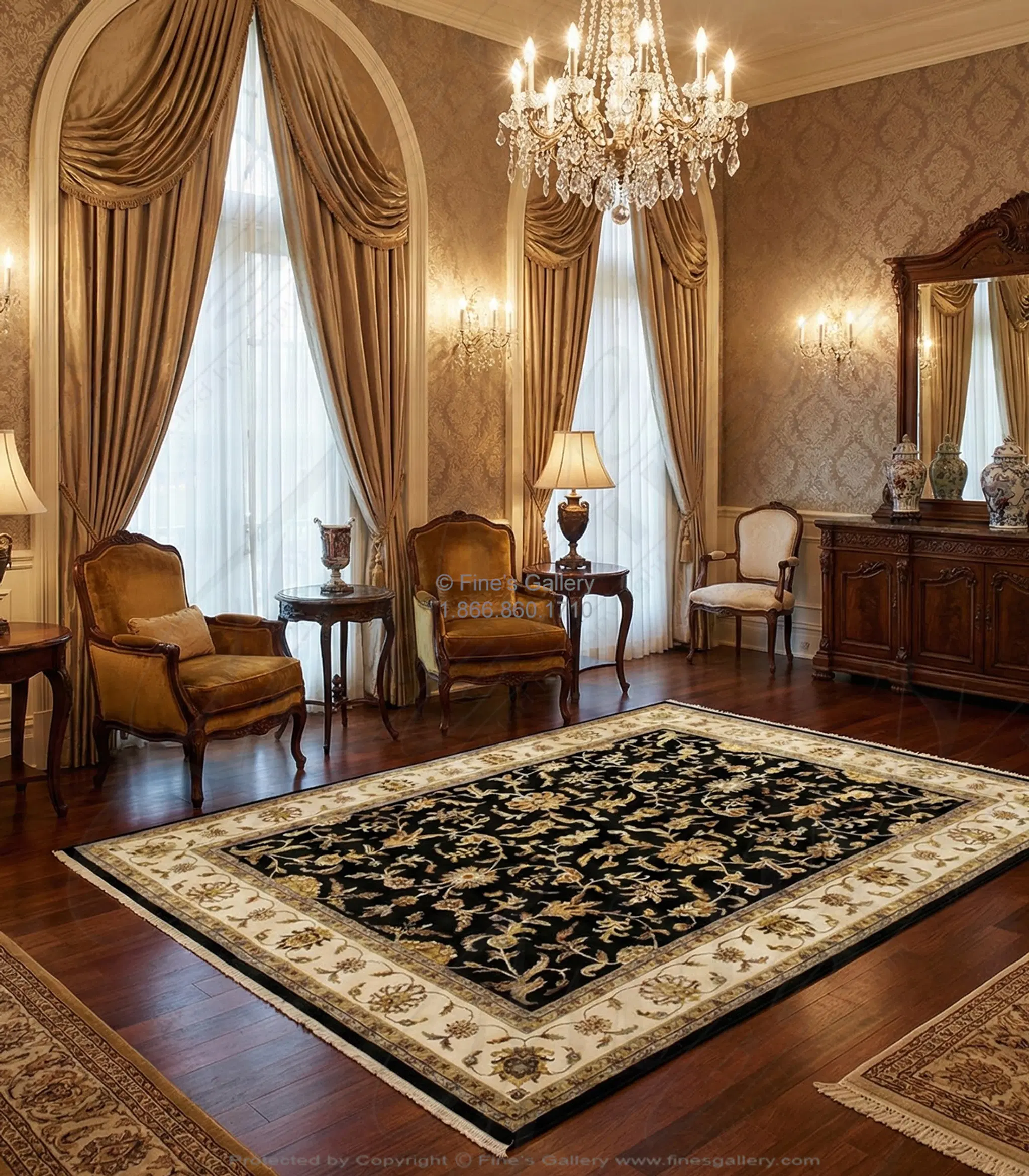 Hand knotted wool rug in deep black with an ivory border. All of the pattern in this rug is raised silk. Please call 1-866-860-1710 and talk with a sales representative at anytime.