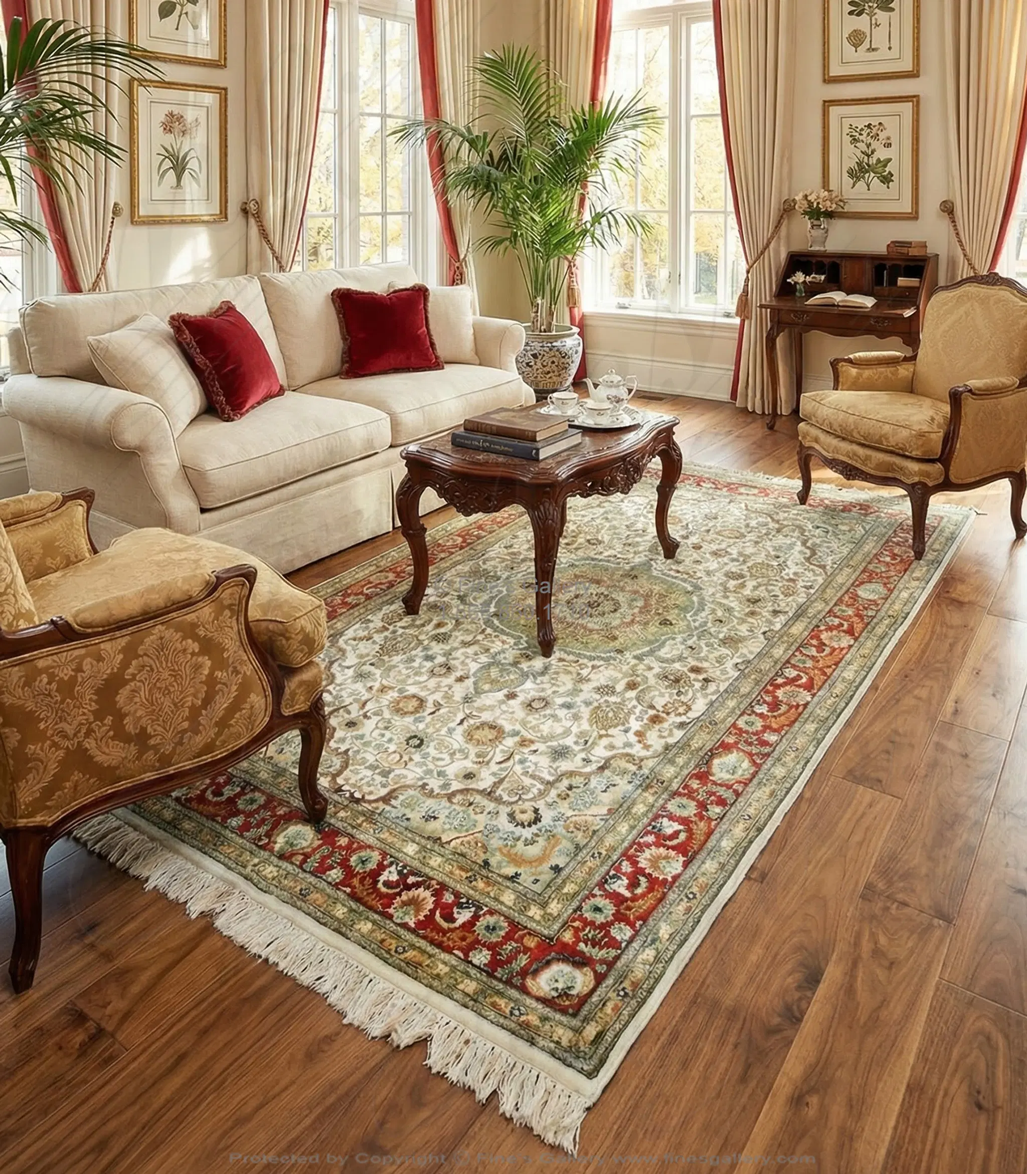 Ivory hand knotted silk rug with a rich red border and a gold medallion center. Please call 1-866-860-1710 and talk with a sales representative at anytime.