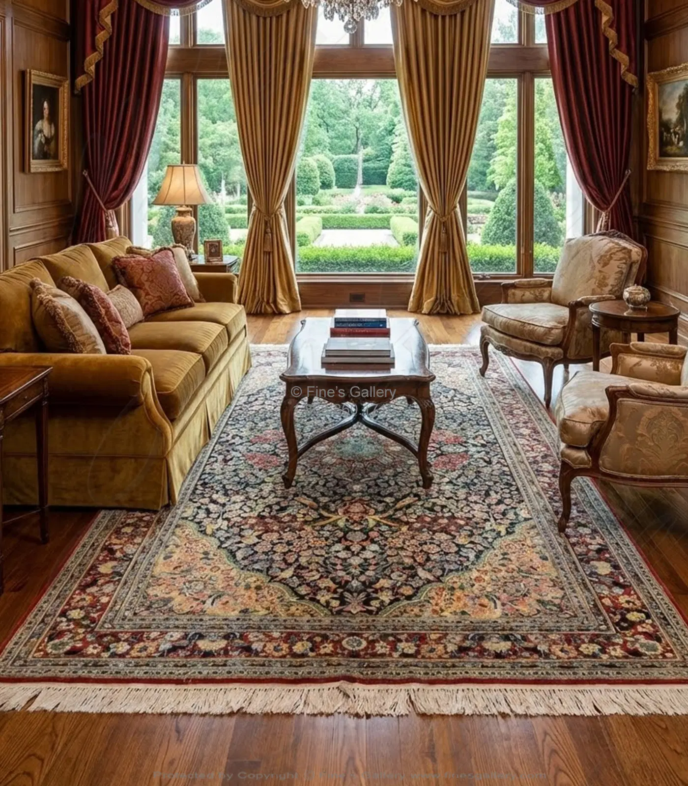 Red coral turquoise and green are in this beautiful hand knotted silk rug. Please call 1-866-860-1710 and talk with a sales representative at anytime.