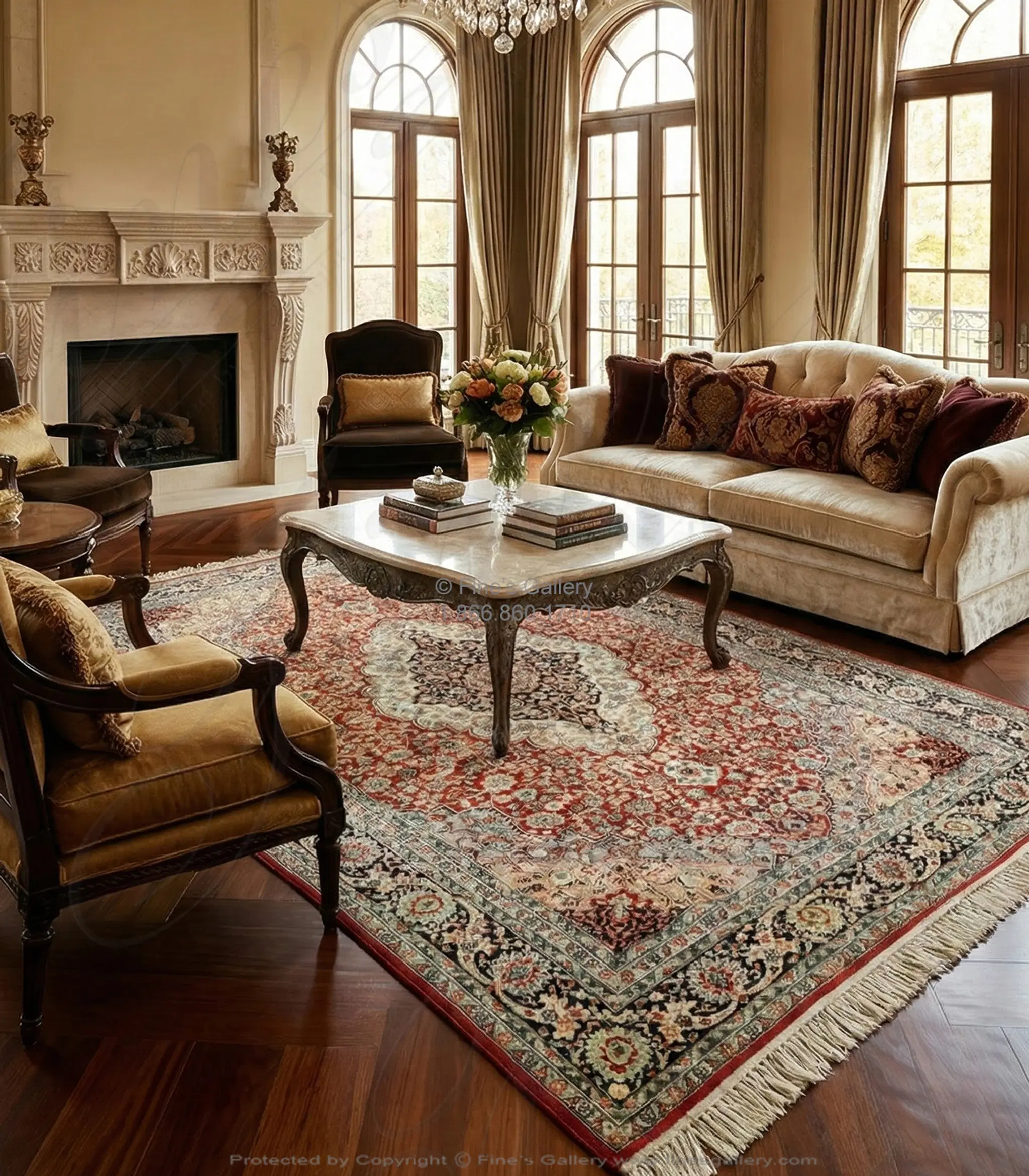 Hand Knotted Silk Rug Rectangle - Cherry Red, Black & Ivory Design - Luxury Home Decor