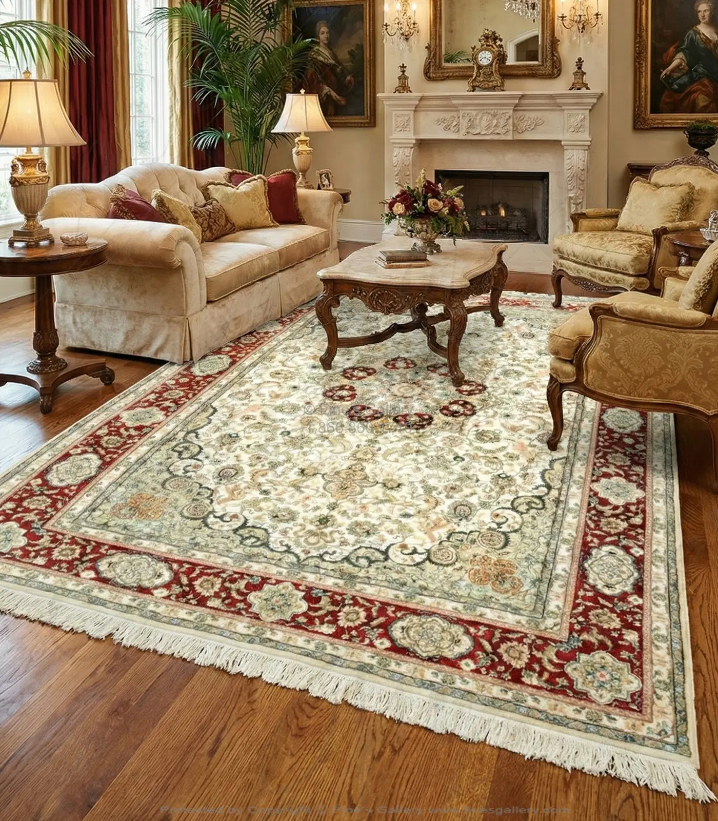 Ivory and red hand knotted silk rug with a beautiful teal going through it. Please call 1-866-860-1710 and talk with a sales representative at anytime.