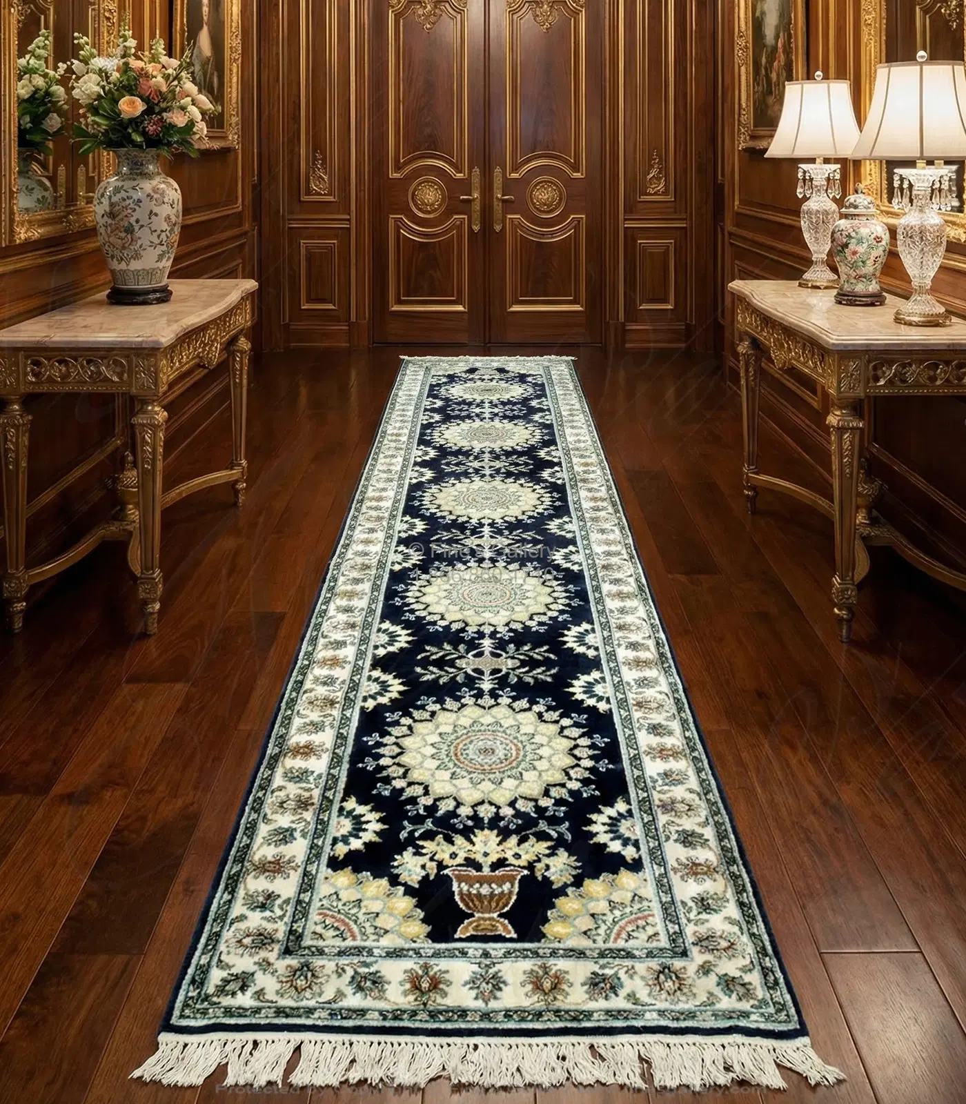 Dark Blue Silk Hand Knotted Rug Runner with Ivory Border - Luxury Oriental Carpet