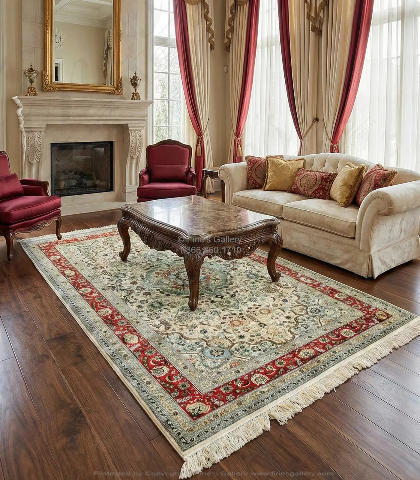 Luxury Ivory Silk Hand-Knotted Rectangle Rug with Green, Gold, Black Accents and Red Border - R7430A