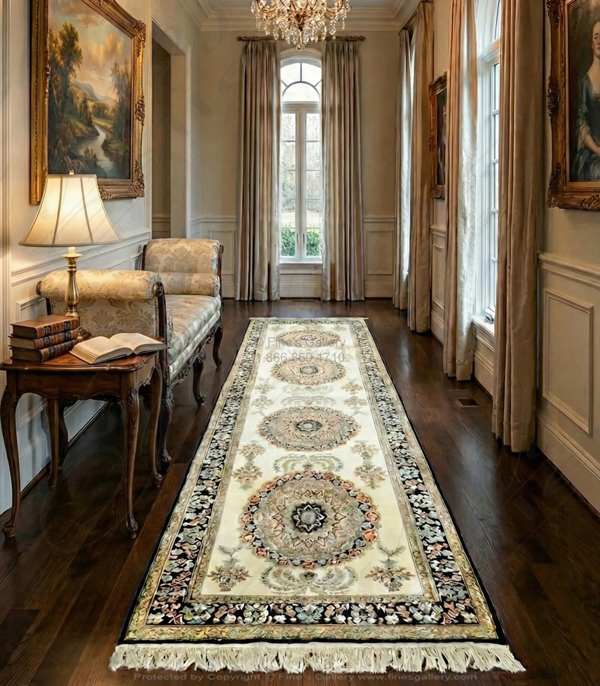 Hand knotted ivory silk runner with black reds and gold. Please call 1-866-860-1710 and talk with a sales representative at anytime.