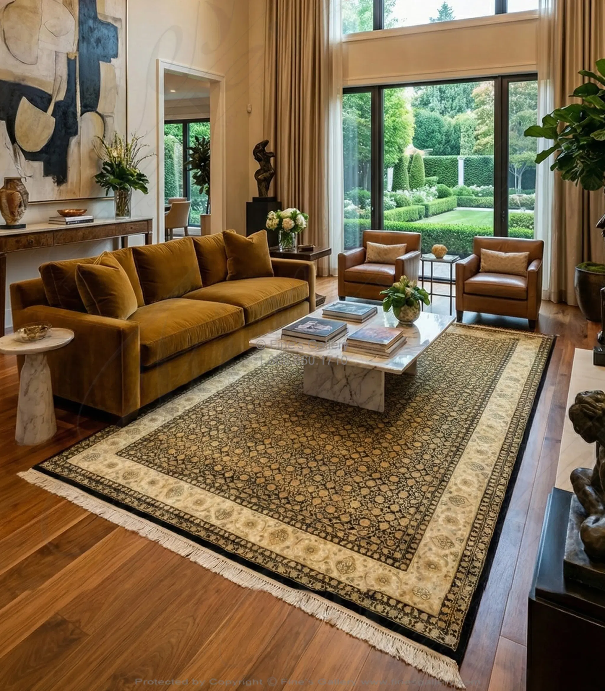 Transitional Silk Rectangular Area Rug - Black and Cream Elegant Design - Fine's Gallery