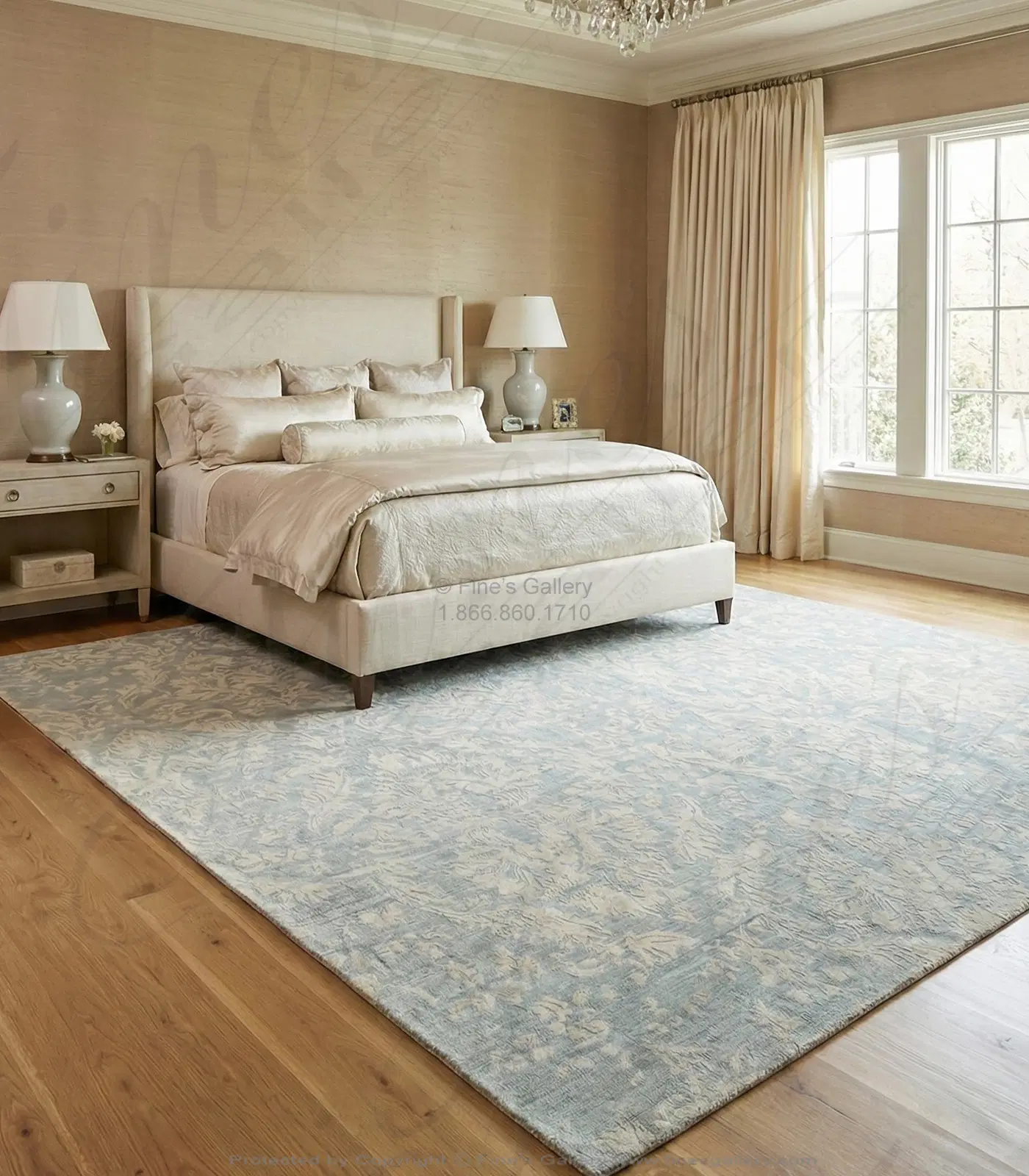 Hand knotted transitional wool rug in soft grey and cream. Please call 1-866-860-1710 and talk with a sales representative at anytime.