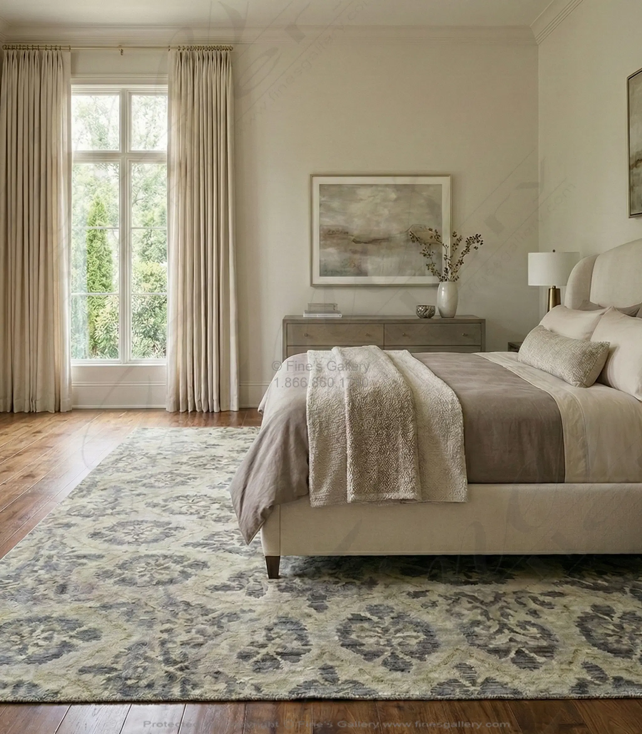 Coastal design in this hand knotted wool rug in shades of blue and cream. Please call 1-866-860-1710 for more information.
