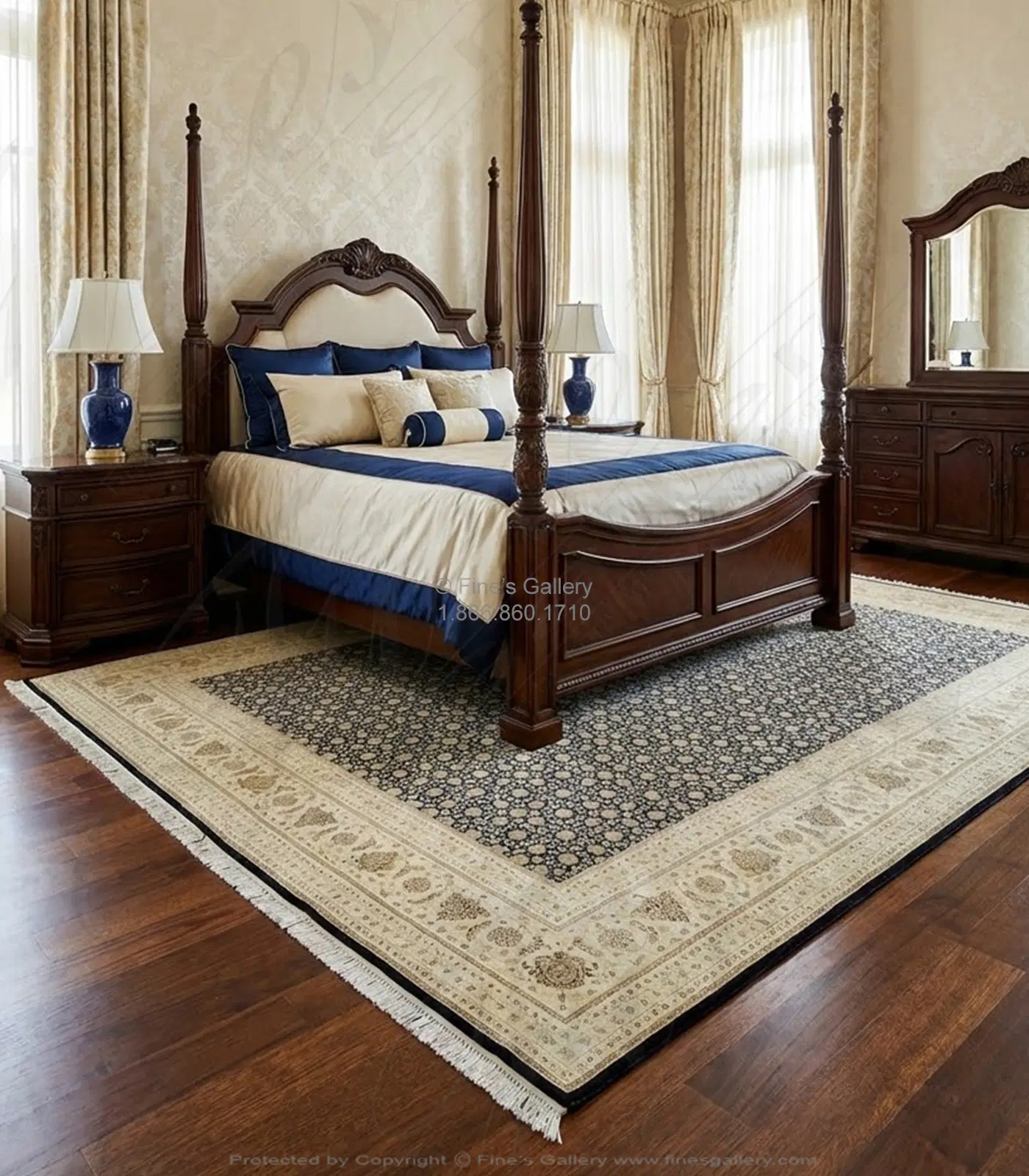 Beautiful black and ivory wool and silk hand knotted area rug. If you require additional information for this productz please call 1-866-860-1710 and talk with a sales representative at anytime.