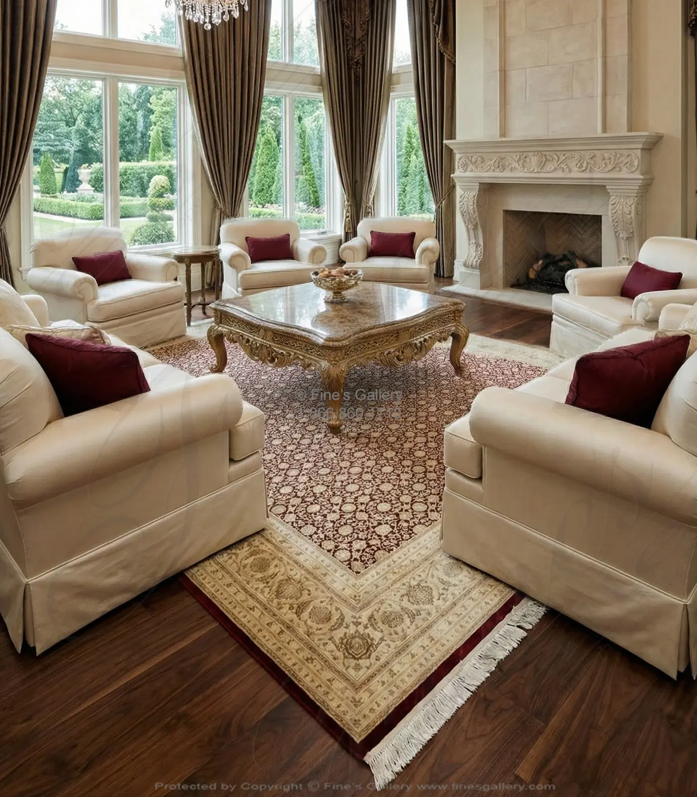 Rich ruby red and pale cream in this hand knotted wool rug in a transitional pattern. Please call 1-866-860-1710 and talk with a sales representative at anytime.