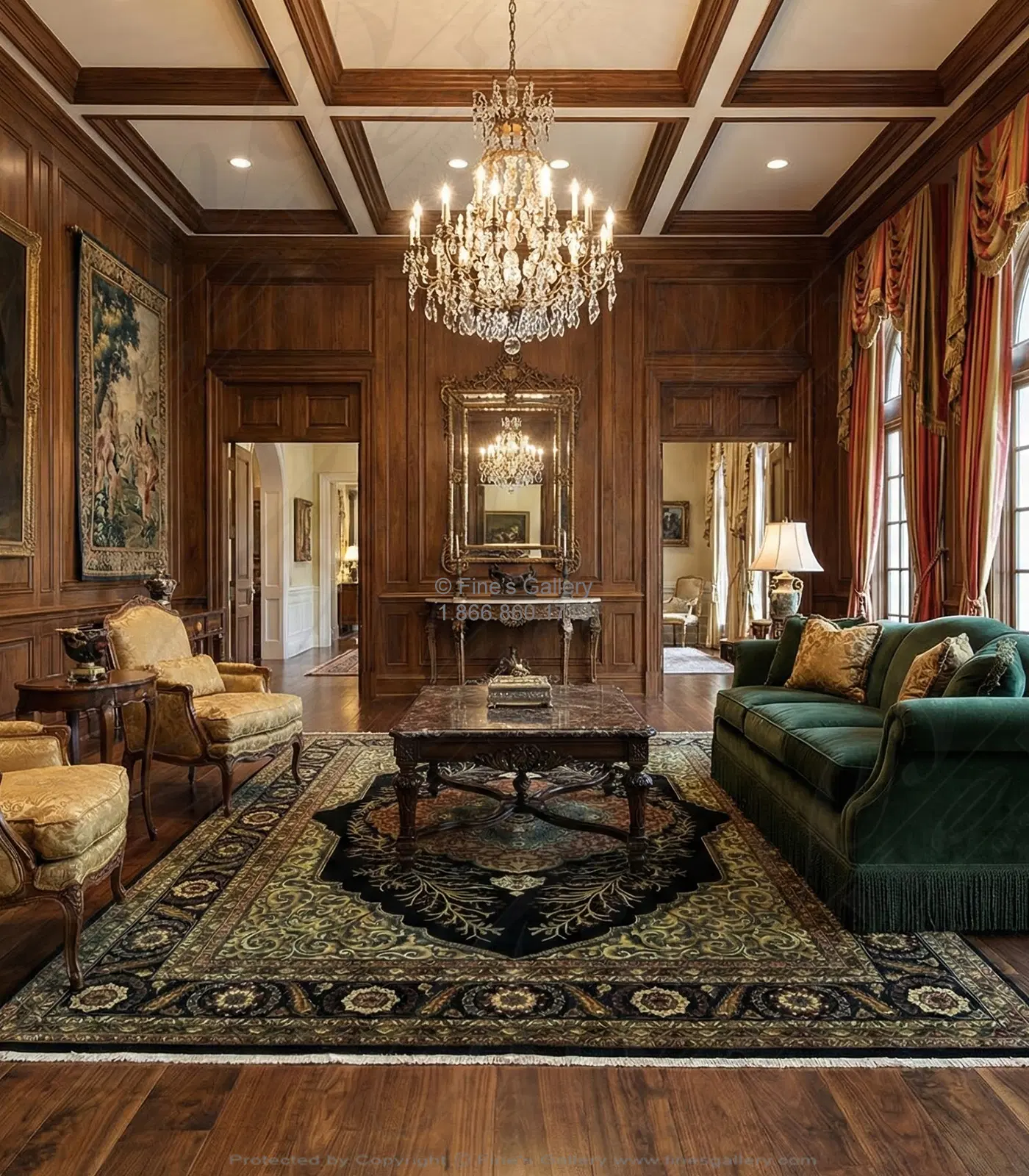 This area rug is very finely hand knotted wool in rich black green and gold with deep red accents. Please call 1-866-860-1710 and talk with a sales representative at anytime.