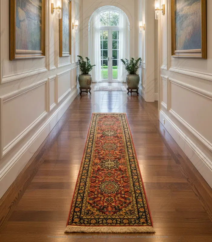 Luxurious Silk Rug Runner with Rich Russet Background and Intricate Black, Gold, and Green Pattern - Elegant Home Decor for Hallways, Entryways, and Living Spaces - Premium Quality Handcrafted Design from Fine's Gallery - Adds Sophisticated Style an