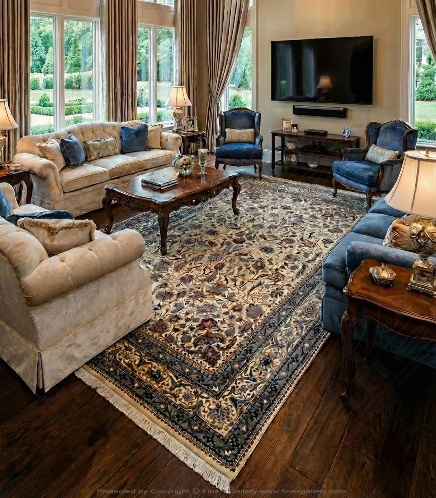 Hand Knotted Wool Rug Rectangle - Navy Blue and Sienna on Ivory Field - Traditional Design