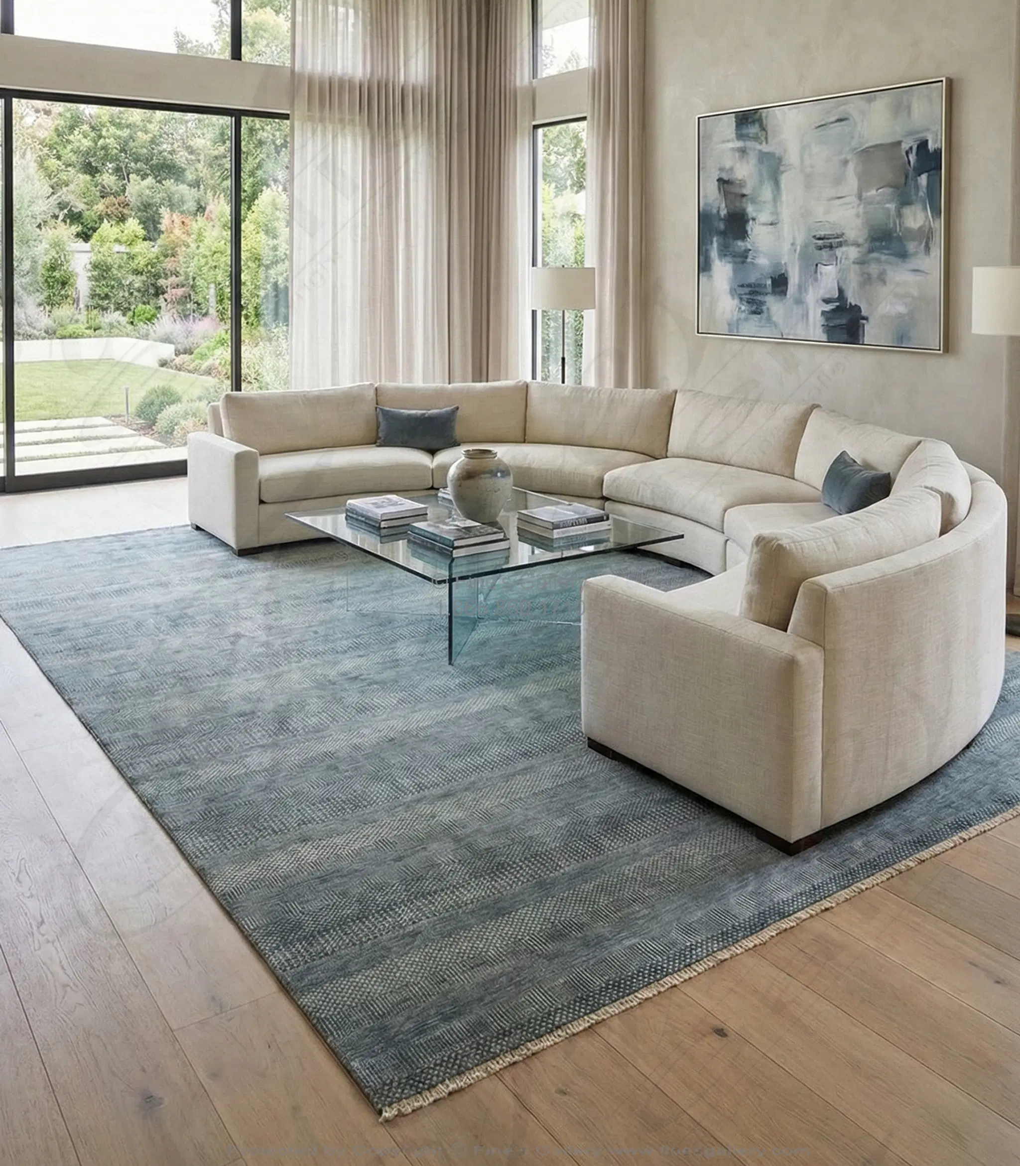 Hand Knotted Wool Rug Rectangle - Blue and Cream Saw Grass Design - Luxury Area Rug