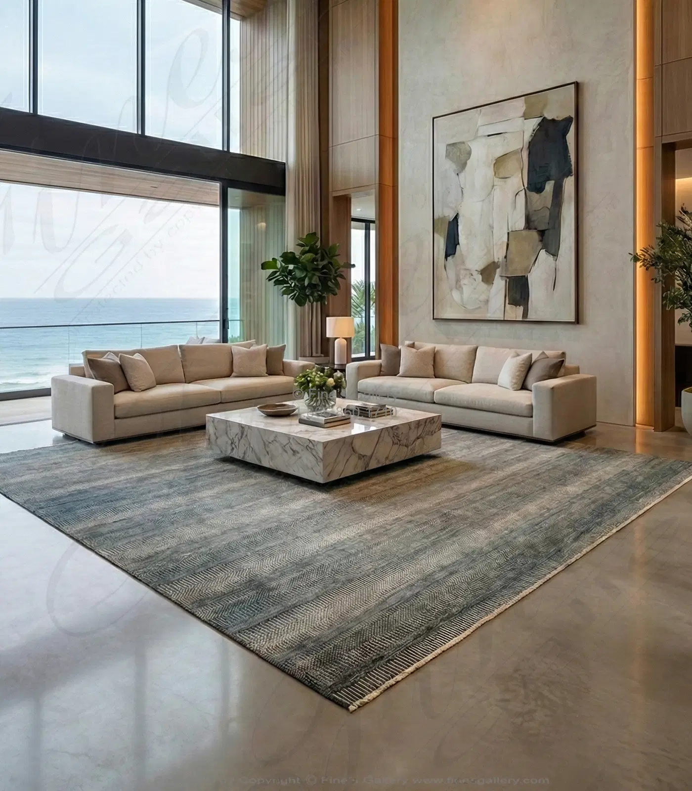 Navy blue and cream in this beautiful wool hand knotted rug in a casual saw grass pattern. Please call 1-866-860-1710 and talk with a sales representative at anytime.