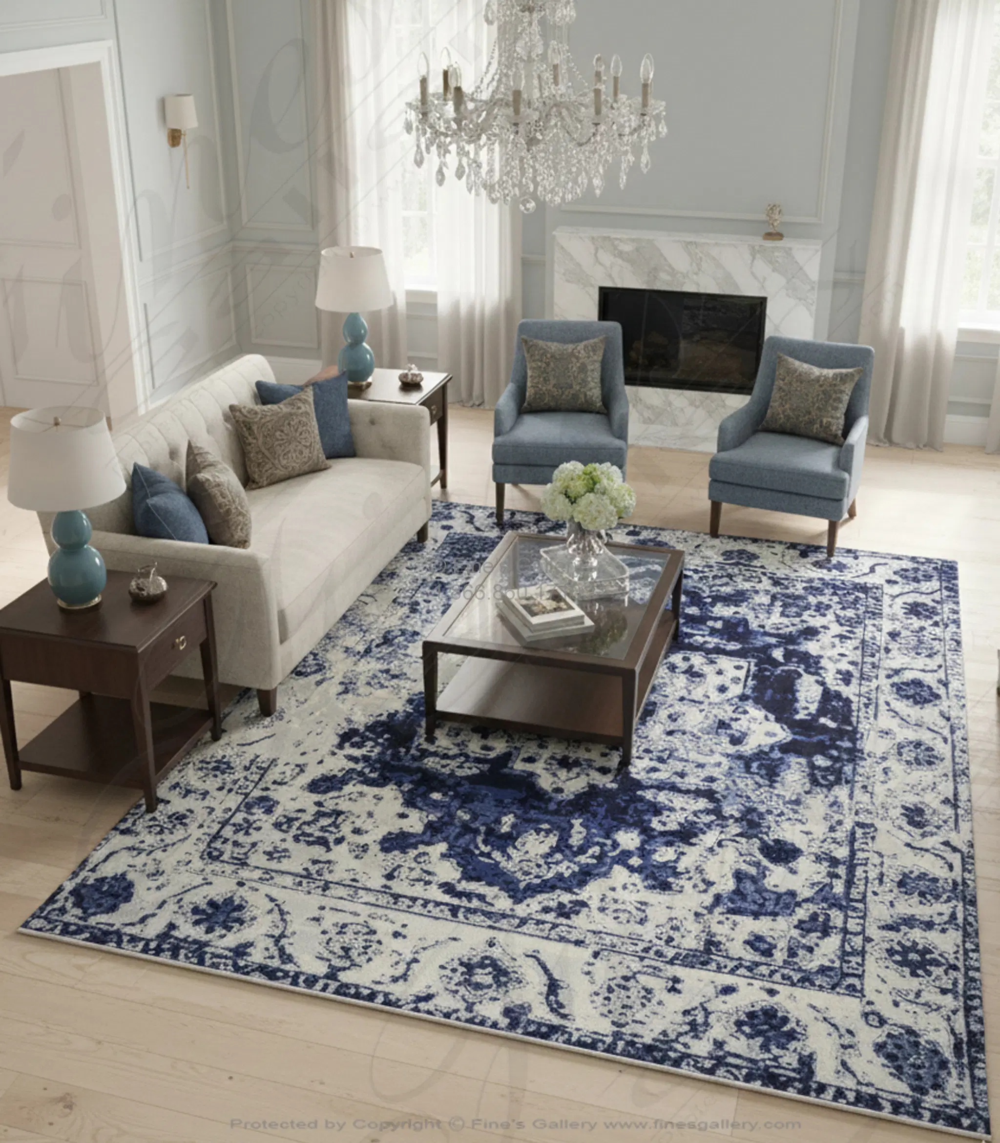 Hand knotted wool rug in a more transitional fade design in beautiful blues and cream. Please call 1-866-860-1710 and talk with a sales representative at anytime.