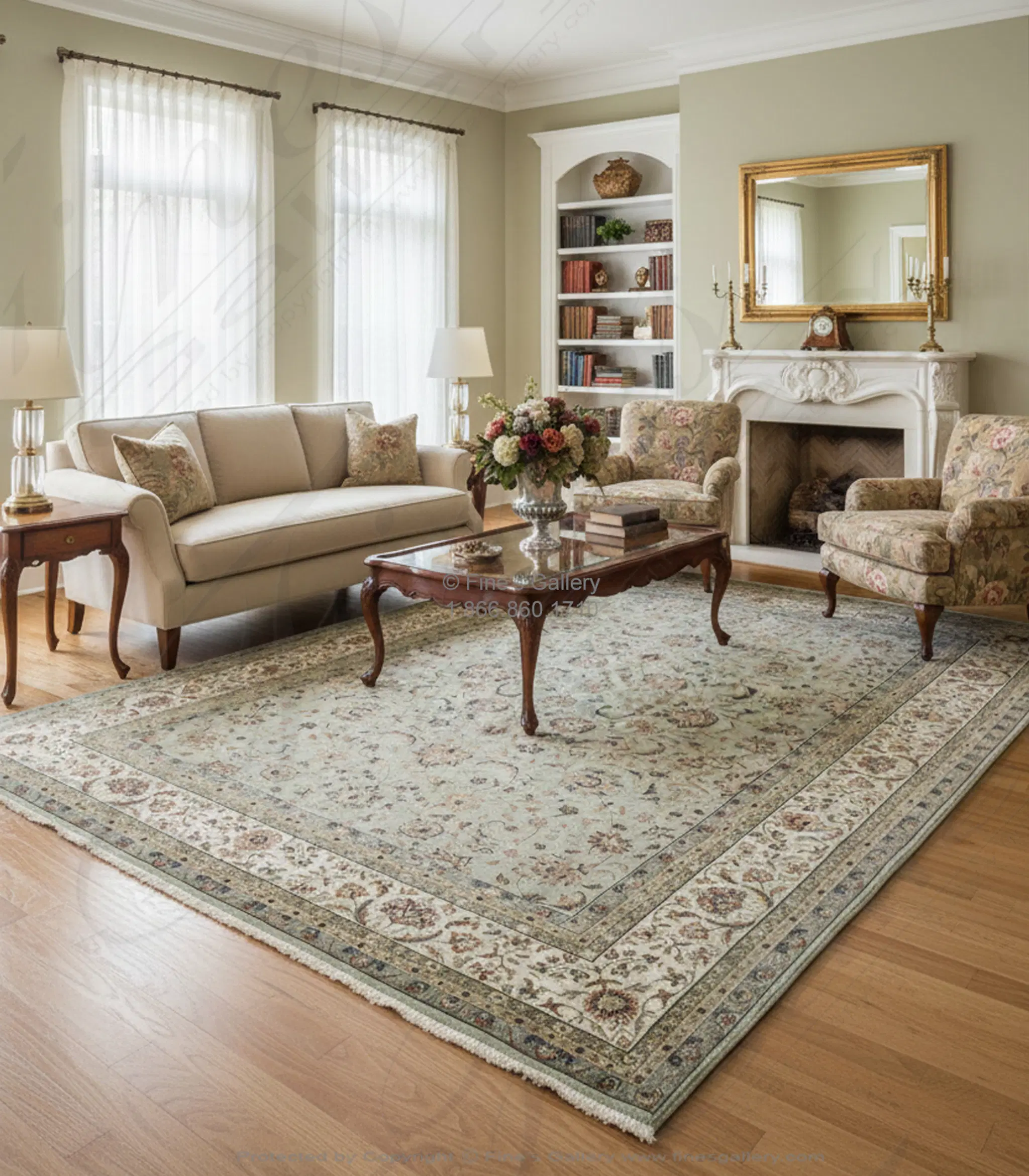 Very fine hand knotted wool kashan in pale green with an ivory border. If you require additional information for this product please call 1-866-860-1710 and talk with a sales representative at anytime.